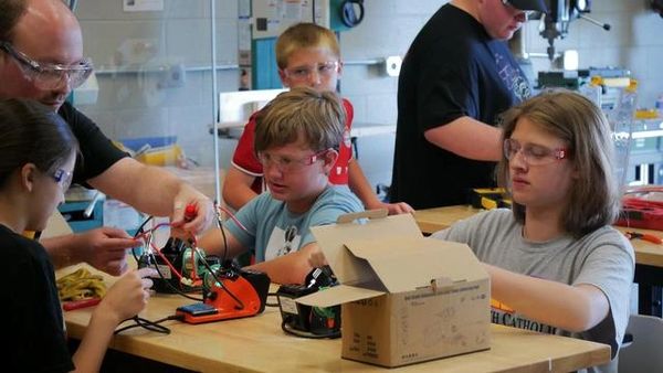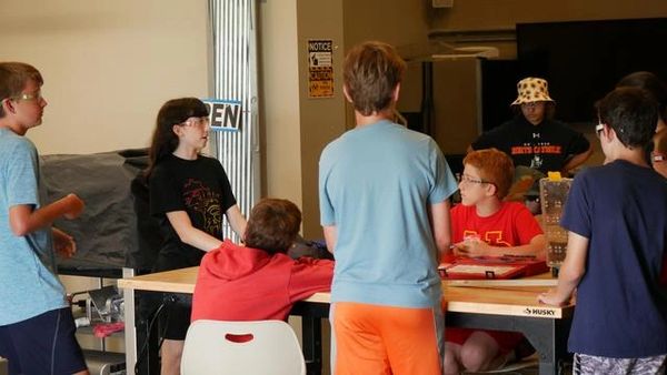 5740 students teach campers the basics of FIRST Robotics Competition - CAD, electronics, software programming, mechanical build, business skills, and award submission while fostering teamwork and gracious professionalism. On the last day of camp, the campers drive their completed robot chassis through an obstacle course. They are judged and our handmade awards are distributed.